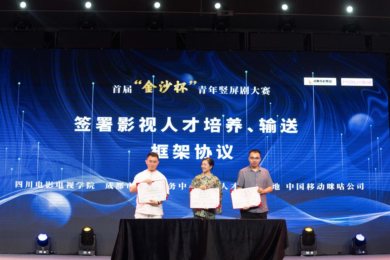中國移動咪咕公司咕咕工作室短劇制片人黃振民 (左)、四川電影電視學院黨委副書記、副校長羅思(中)、成都市影視服務中心人才孵化基地負責人張易(右)簽署影視人才培養、輸送框架合作協議